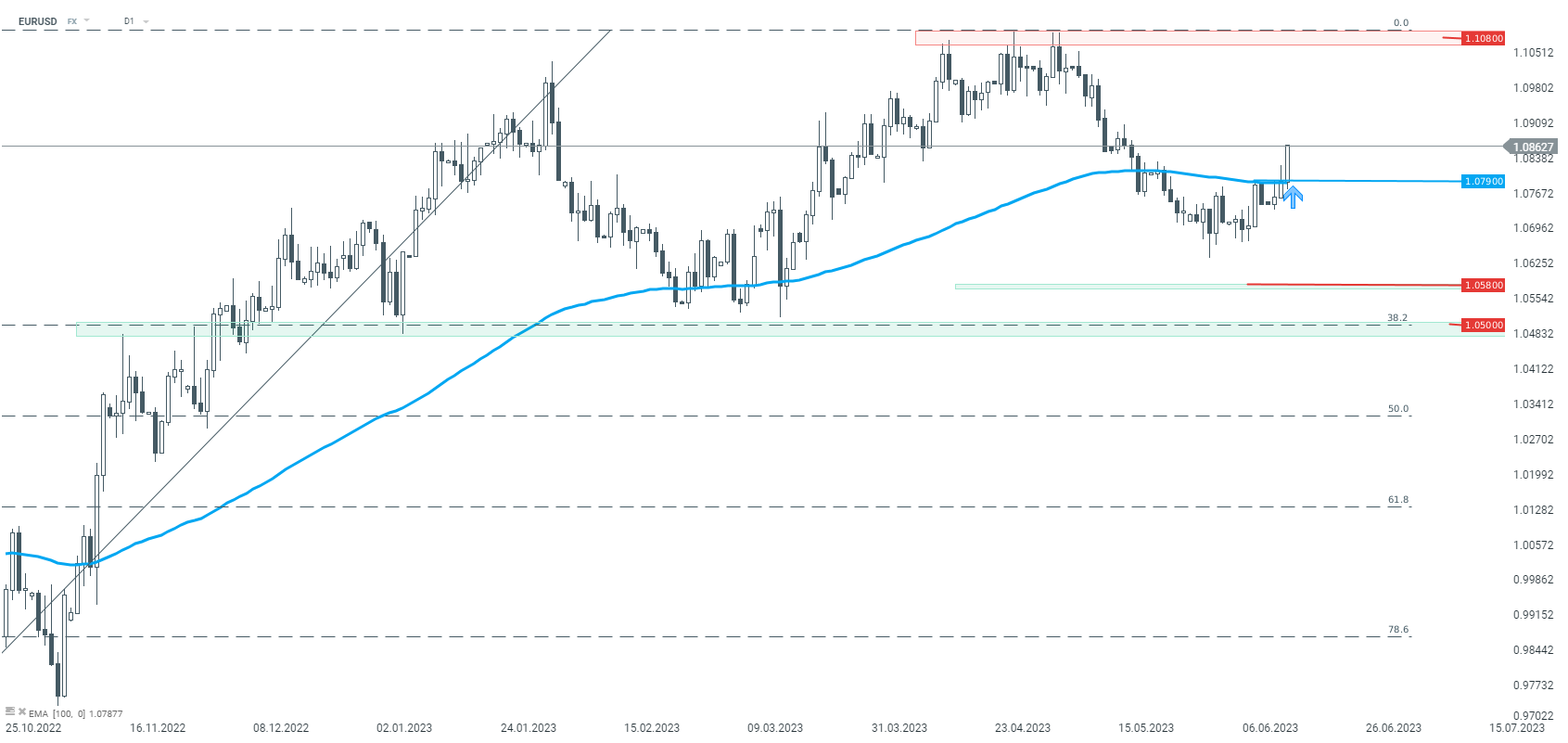 Zatímco americké indexy v poslední době posilovaly v souvislosti s poklesem očekávání zvýšení sazeb Fedu, situace na Wall Street je dnes smíšená a odráží nejistotu ohledně budoucího zpřísnění. Dnešní holubičí zpráva z Fedu by mohla pomoci posunout US500 nad hranici 4 400 bodů. Zdroj: xStation5