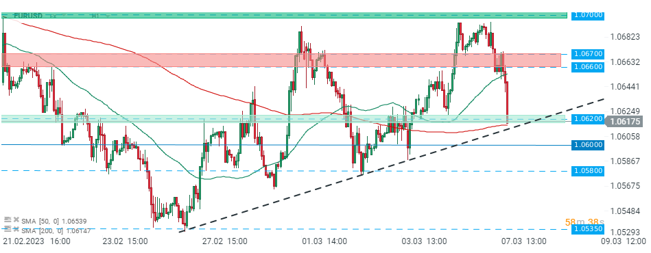 Pár EURUSD prudce klesl a testuje podporu na úrovni 1,0620. Zdroj: xStation5