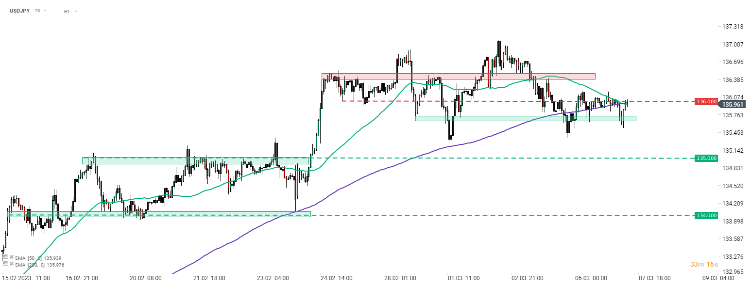 USDJPY koriguje z úrovní více důležitých rezistencí v intervalu H1 – 50 období klouzavý průměr, 200 období klouzavý průměr a oblast swingu 136,00. Úroveň 200 období klouzavý průměr v intervalu H1 fungoval dříve jako důležitý support a neschopnost průlomu zpět nad tuto úroveň může být předzvěstí období oslabení USDJPY. Zdroj: xStation5