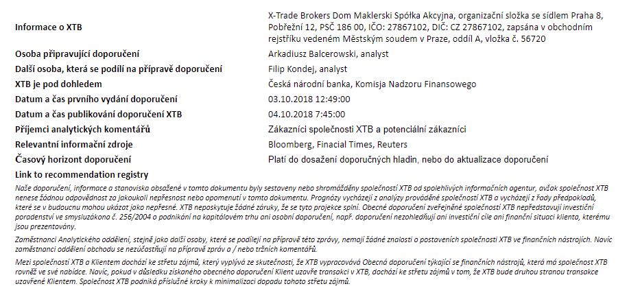 Rozdílové smlouvy jsou komplexní nástroje a v důsledku použití finanční páky jsou spojeny s vysokým rizikem rychlého vzniku finanční ztráty. U 71 % účtů retailových investorů došlo při obchodování s rozdílovými smlouvami u tohoto poskytovatele ke vzniku ztráty. Měli byste zvážit, zda rozumíte tomu, jak rozdílové smlouvy fungují, a zda si můžete dovolit vysoké riziko ztráty svých finančních prostředků. Investování je rizikové. Investujte zodpovědně. Tento materiál je marketingovou komunikací ve smyslu čl. 24 odst. 3 směrnice Evropského parlamentu a Rady 2014/65/EU ze dne 15. května 2014 o trzích finančních nástrojů, kterou se mění směrnice 2002/92/ES a směrnice 2011/61/EU (MiFID II). Marketingová komunikace není investiční doporučení ani informace doporučující či navrhující investiční strategii ve smyslu nařízení Evropského parlamentu a Rady (EU) č. 596/2014 ze dne 16. dubna 2014 o zneužívání trhu (nařízení o zneužívání trhu) a o zrušení směrnice Evropského parlamentu a Rady 2003/6/ES a směrnic Komise 2003/124/ES, 2003/125/ES a 2004/72/ES a nařízení Komise v přenesené pravomoci (EU) 2016/958 ze dne 9. března 2016, kterým se doplňuje nařízení Evropského parlamentu a Rady (EU) č. 596/2014, pokud jde o regulační technické normy pro technická ujednání pro objektivní předkládání investičních doporučení nebo jiných informací doporučujících nebo navrhujících investiční strategie a pro zveřejnění konkrétních zájmů nebo náznaků střetu zájmů nebo jakékoli jiné rady, a to i v oblasti investičního poradenství, ve smyslu zákona č. 256/2004 Sb., o podnikání na kapitálovém trhu. Marketingová komunikace je připravena s nejvyšší pečlivostí, objektivitou, prezentuje fakta známé autorovi k datu přípravy a neobsahuje žádné hodnotící prvky. Marketingová komunikace je připravena bez zohlednění potřeb klienta, jeho individuální finanční situace a nijak nepředstavuje investiční strategii. Marketingová komunikace nepředstavuje nabídku k prodeji, nabídku, předplatné, výzvu na nákup, reklamu nebo propagaci jakýchkoliv finančních nástrojů. Společnost XTB S.A., organizační složka nenese odpovědnost za jakékoli jednání nebo opomenutí klienta, zejména za získání nebo zcizení finančních nástrojů, na základě informací obsažených v této marketingové komunikaci. V případě, že marketingová komunikace obsahuje jakékoli informace o jakýchkoli výsledcích týkajících se finančních nástrojů v nich uvedených, nepředstavují žádnou záruku ani předpověď ohledně budoucích výsledků. Minulá výkonnost nemusí nutně vypovídat o budoucích výsledcích a každá osoba jednající na základě těchto informací tak činí zcela na vlastní riziko.