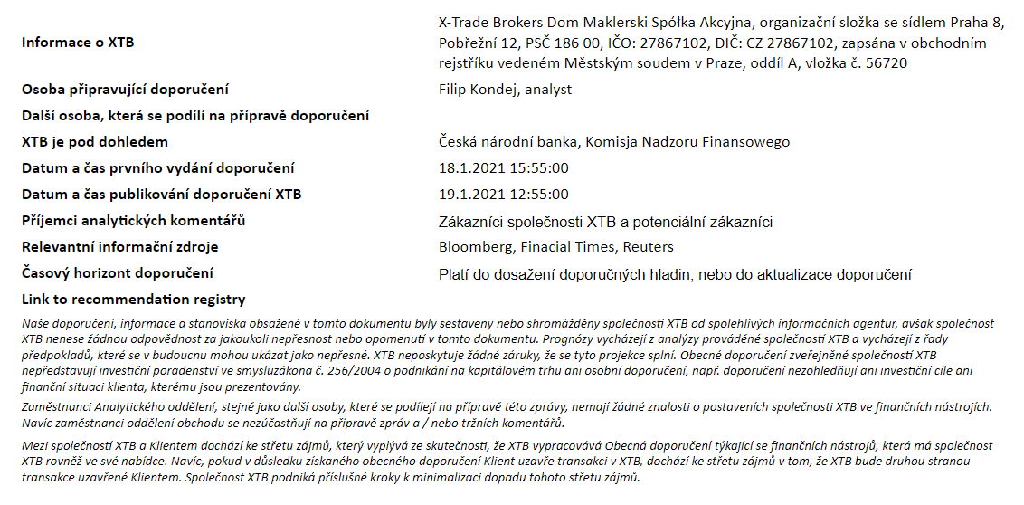 Rozdílové smlouvy jsou komplexní nástroje a v důsledku použití finanční páky jsou spojeny s vysokým rizikem rychlého vzniku finanční ztráty. U 71 % účtů retailových investorů došlo při obchodování s rozdílovými smlouvami u tohoto poskytovatele ke vzniku ztráty. Měli byste zvážit, zda rozumíte tomu, jak rozdílové smlouvy fungují, a zda si můžete dovolit vysoké riziko ztráty svých finančních prostředků. Investování je rizikové. Investujte zodpovědně. Tento materiál je marketingovou komunikací ve smyslu čl. 24 odst. 3 směrnice Evropského parlamentu a Rady 2014/65/EU ze dne 15. května 2014 o trzích finančních nástrojů, kterou se mění směrnice 2002/92/ES a směrnice 2011/61/EU (MiFID II). Marketingová komunikace není investiční doporučení ani informace doporučující či navrhující investiční strategii ve smyslu nařízení Evropského parlamentu a Rady (EU) č. 596/2014 ze dne 16. dubna 2014 o zneužívání trhu (nařízení o zneužívání trhu) a o zrušení směrnice Evropského parlamentu a Rady 2003/6/ES a směrnic Komise 2003/124/ES, 2003/125/ES a 2004/72/ES a nařízení Komise v přenesené pravomoci (EU) 2016/958 ze dne 9. března 2016, kterým se doplňuje nařízení Evropského parlamentu a Rady (EU) č. 596/2014, pokud jde o regulační technické normy pro technická ujednání pro objektivní předkládání investičních doporučení nebo jiných informací doporučujících nebo navrhujících investiční strategie a pro zveřejnění konkrétních zájmů nebo náznaků střetu zájmů nebo jakékoli jiné rady, a to i v oblasti investičního poradenství, ve smyslu zákona č. 256/2004 Sb., o podnikání na kapitálovém trhu. Marketingová komunikace je připravena s nejvyšší pečlivostí, objektivitou, prezentuje fakta známé autorovi k datu přípravy a neobsahuje žádné hodnotící prvky. Marketingová komunikace je připravena bez zohlednění potřeb klienta, jeho individuální finanční situace a nijak nepředstavuje investiční strategii. Marketingová komunikace nepředstavuje nabídku k prodeji, nabídku, předplatné, výzvu na nákup, reklamu nebo propagaci jakýchkoliv finančních nástrojů. Společnost XTB S.A., organizační složka nenese odpovědnost za jakékoli jednání nebo opomenutí klienta, zejména za získání nebo zcizení finančních nástrojů, na základě informací obsažených v této marketingové komunikaci. V případě, že marketingová komunikace obsahuje jakékoli informace o jakýchkoli výsledcích týkajících se finančních nástrojů v nich uvedených, nepředstavují žádnou záruku ani předpověď ohledně budoucích výsledků. Minulá výkonnost nemusí nutně vypovídat o budoucích výsledcích a každá osoba jednající na základě těchto informací tak činí zcela na vlastní riziko.