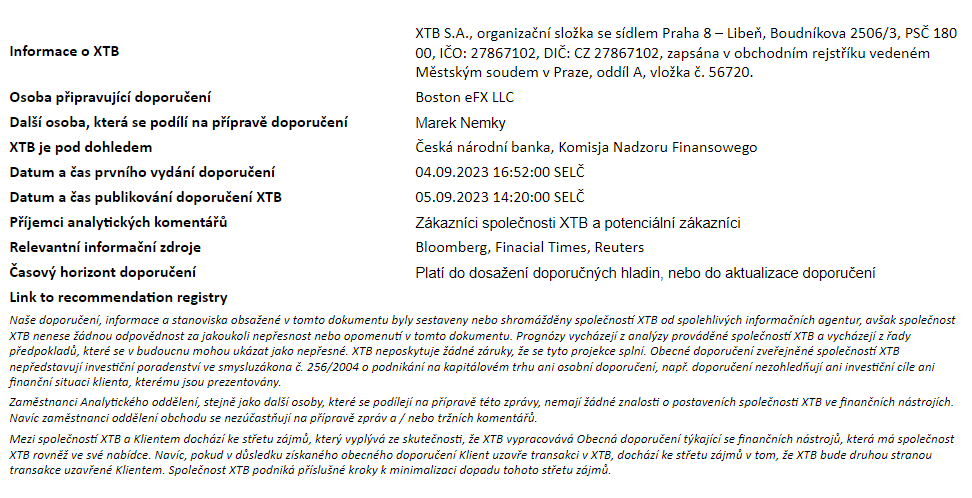 Rozdílové smlouvy jsou komplexní nástroje a v důsledku použití finanční páky jsou spojeny s vysokým rizikem rychlého vzniku finanční ztráty. U 71 % účtů retailových investorů došlo při obchodování s rozdílovými smlouvami u tohoto poskytovatele ke vzniku ztráty. Měli byste zvážit, zda rozumíte tomu, jak rozdílové smlouvy fungují, a zda si můžete dovolit vysoké riziko ztráty svých finančních prostředků. Investování je rizikové. Investujte zodpovědně. Tento materiál je marketingovou komunikací ve smyslu čl. 24 odst. 3 směrnice Evropského parlamentu a Rady 2014/65/EU ze dne 15. května 2014 o trzích finančních nástrojů, kterou se mění směrnice 2002/92/ES a směrnice 2011/61/EU (MiFID II). Marketingová komunikace není investiční doporučení ani informace doporučující či navrhující investiční strategii ve smyslu nařízení Evropského parlamentu a Rady (EU) č. 596/2014 ze dne 16. dubna 2014 o zneužívání trhu (nařízení o zneužívání trhu) a o zrušení směrnice Evropského parlamentu a Rady 2003/6/ES a směrnic Komise 2003/124/ES, 2003/125/ES a 2004/72/ES a nařízení Komise v přenesené pravomoci (EU) 2016/958 ze dne 9. března 2016, kterým se doplňuje nařízení Evropského parlamentu a Rady (EU) č. 596/2014, pokud jde o regulační technické normy pro technická ujednání pro objektivní předkládání investičních doporučení nebo jiných informací doporučujících nebo navrhujících investiční strategie a pro zveřejnění konkrétních zájmů nebo náznaků střetu zájmů nebo jakékoli jiné rady, a to i v oblasti investičního poradenství, ve smyslu zákona č. 256/2004 Sb., o podnikání na kapitálovém trhu. Marketingová komunikace je připravena s nejvyšší pečlivostí, objektivitou, prezentuje fakta známé autorovi k datu přípravy a neobsahuje žádné hodnotící prvky. Marketingová komunikace je připravena bez zohlednění potřeb klienta, jeho individuální finanční situace a nijak nepředstavuje investiční strategii. Marketingová komunikace nepředstavuje nabídku k prodeji, nabídku, předplatné, výzvu na nákup, reklamu nebo propagaci jakýchkoliv finančních nástrojů. Společnost XTB S.A., organizační složka nenese odpovědnost za jakékoli jednání nebo opomenutí klienta, zejména za získání nebo zcizení finančních nástrojů, na základě informací obsažených v této marketingové komunikaci. V případě, že marketingová komunikace obsahuje jakékoli informace o jakýchkoli výsledcích týkajících se finančních nástrojů v nich uvedených, nepředstavují žádnou záruku ani předpověď ohledně budoucích výsledků. Minulá výkonnost nemusí nutně vypovídat o budoucích výsledcích a každá osoba jednající na základě těchto informací tak činí zcela na vlastní riziko.
