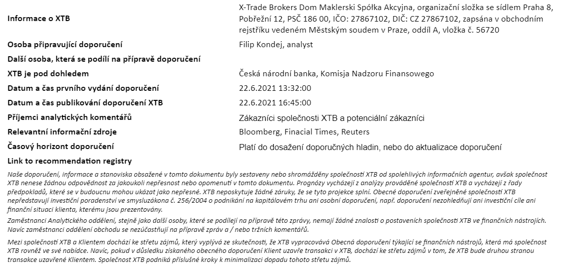Rozdílové smlouvy jsou komplexní nástroje a v důsledku použití finanční páky jsou spojeny s vysokým rizikem rychlého vzniku finanční ztráty. U 71 % účtů retailových investorů došlo při obchodování s rozdílovými smlouvami u tohoto poskytovatele ke vzniku ztráty. Měli byste zvážit, zda rozumíte tomu, jak rozdílové smlouvy fungují, a zda si můžete dovolit vysoké riziko ztráty svých finančních prostředků. Investování je rizikové. Investujte zodpovědně. Tento materiál je marketingovou komunikací ve smyslu čl. 24 odst. 3 směrnice Evropského parlamentu a Rady 2014/65/EU ze dne 15. května 2014 o trzích finančních nástrojů, kterou se mění směrnice 2002/92/ES a směrnice 2011/61/EU (MiFID II). Marketingová komunikace není investiční doporučení ani informace doporučující či navrhující investiční strategii ve smyslu nařízení Evropského parlamentu a Rady (EU) č. 596/2014 ze dne 16. dubna 2014 o zneužívání trhu (nařízení o zneužívání trhu) a o zrušení směrnice Evropského parlamentu a Rady 2003/6/ES a směrnic Komise 2003/124/ES, 2003/125/ES a 2004/72/ES a nařízení Komise v přenesené pravomoci (EU) 2016/958 ze dne 9. března 2016, kterým se doplňuje nařízení Evropského parlamentu a Rady (EU) č. 596/2014, pokud jde o regulační technické normy pro technická ujednání pro objektivní předkládání investičních doporučení nebo jiných informací doporučujících nebo navrhujících investiční strategie a pro zveřejnění konkrétních zájmů nebo náznaků střetu zájmů nebo jakékoli jiné rady, a to i v oblasti investičního poradenství, ve smyslu zákona č. 256/2004 Sb., o podnikání na kapitálovém trhu. Marketingová komunikace je připravena s nejvyšší pečlivostí, objektivitou, prezentuje fakta známé autorovi k datu přípravy a neobsahuje žádné hodnotící prvky. Marketingová komunikace je připravena bez zohlednění potřeb klienta, jeho individuální finanční situace a nijak nepředstavuje investiční strategii. Marketingová komunikace nepředstavuje nabídku k prodeji, nabídku, předplatné, výzvu na nákup, reklamu nebo propagaci jakýchkoliv finančních nástrojů. Společnost XTB S.A., organizační složka nenese odpovědnost za jakékoli jednání nebo opomenutí klienta, zejména za získání nebo zcizení finančních nástrojů, na základě informací obsažených v této marketingové komunikaci. V případě, že marketingová komunikace obsahuje jakékoli informace o jakýchkoli výsledcích týkajících se finančních nástrojů v nich uvedených, nepředstavují žádnou záruku ani předpověď ohledně budoucích výsledků. Minulá výkonnost nemusí nutně vypovídat o budoucích výsledcích a každá osoba jednající na základě těchto informací tak činí zcela na vlastní riziko.