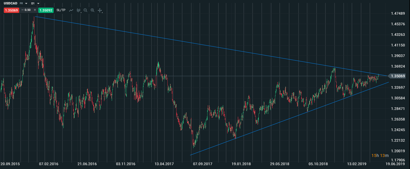 Prostor k dalšímu růstu se přitom zdá být omezený i z hlediska techniky. USDCAD se totiž dostává na horní hranu zajímavé trojúhelníkové formace.