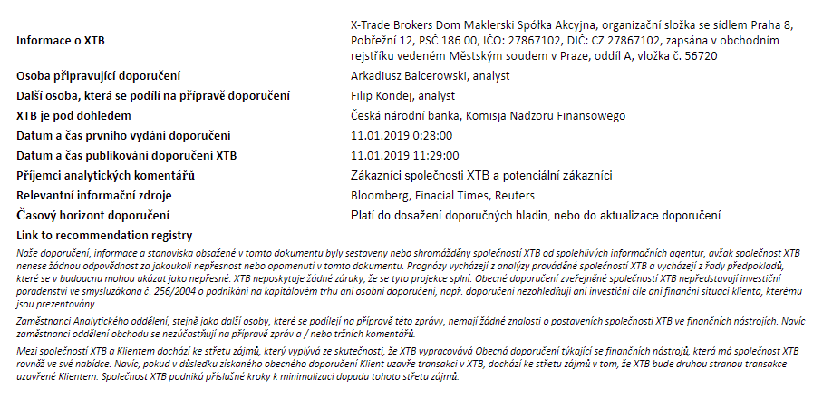 Rozdílové smlouvy jsou komplexní nástroje a v důsledku použití finanční páky jsou spojeny s vysokým rizikem rychlého vzniku finanční ztráty. U 71 % účtů retailových investorů došlo při obchodování s rozdílovými smlouvami u tohoto poskytovatele ke vzniku ztráty. Měli byste zvážit, zda rozumíte tomu, jak rozdílové smlouvy fungují, a zda si můžete dovolit vysoké riziko ztráty svých finančních prostředků. Investování je rizikové. Investujte zodpovědně. Tento materiál je marketingovou komunikací ve smyslu čl. 24 odst. 3 směrnice Evropského parlamentu a Rady 2014/65/EU ze dne 15. května 2014 o trzích finančních nástrojů, kterou se mění směrnice 2002/92/ES a směrnice 2011/61/EU (MiFID II). Marketingová komunikace není investiční doporučení ani informace doporučující či navrhující investiční strategii ve smyslu nařízení Evropského parlamentu a Rady (EU) č. 596/2014 ze dne 16. dubna 2014 o zneužívání trhu (nařízení o zneužívání trhu) a o zrušení směrnice Evropského parlamentu a Rady 2003/6/ES a směrnic Komise 2003/124/ES, 2003/125/ES a 2004/72/ES a nařízení Komise v přenesené pravomoci (EU) 2016/958 ze dne 9. března 2016, kterým se doplňuje nařízení Evropského parlamentu a Rady (EU) č. 596/2014, pokud jde o regulační technické normy pro technická ujednání pro objektivní předkládání investičních doporučení nebo jiných informací doporučujících nebo navrhujících investiční strategie a pro zveřejnění konkrétních zájmů nebo náznaků střetu zájmů nebo jakékoli jiné rady, a to i v oblasti investičního poradenství, ve smyslu zákona č. 256/2004 Sb., o podnikání na kapitálovém trhu. Marketingová komunikace je připravena s nejvyšší pečlivostí, objektivitou, prezentuje fakta známé autorovi k datu přípravy a neobsahuje žádné hodnotící prvky. Marketingová komunikace je připravena bez zohlednění potřeb klienta, jeho individuální finanční situace a nijak nepředstavuje investiční strategii. Marketingová komunikace nepředstavuje nabídku k prodeji, nabídku, předplatné, výzvu na nákup, reklamu nebo propagaci jakýchkoliv finančních nástrojů. Společnost XTB S.A., organizační složka nenese odpovědnost za jakékoli jednání nebo opomenutí klienta, zejména za získání nebo zcizení finančních nástrojů, na základě informací obsažených v této marketingové komunikaci. V případě, že marketingová komunikace obsahuje jakékoli informace o jakýchkoli výsledcích týkajících se finančních nástrojů v nich uvedených, nepředstavují žádnou záruku ani předpověď ohledně budoucích výsledků. Minulá výkonnost nemusí nutně vypovídat o budoucích výsledcích a každá osoba jednající na základě těchto informací tak činí zcela na vlastní riziko.