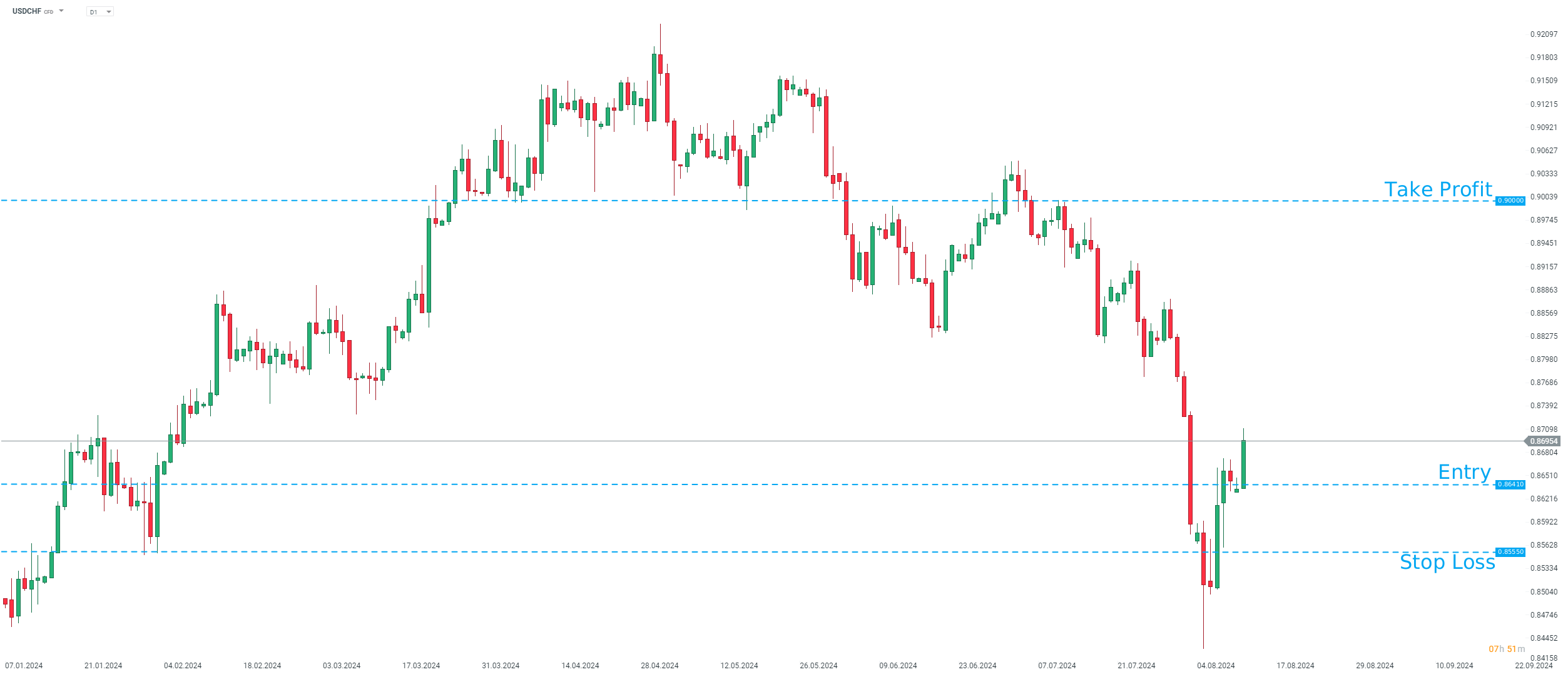 ANZ doporučuje zaujmout dlouhou pozici na USDCHF za tržní cenu s cílem 0,9000 a stop loss příkazem na 0,8555. Zdroj: xStation5