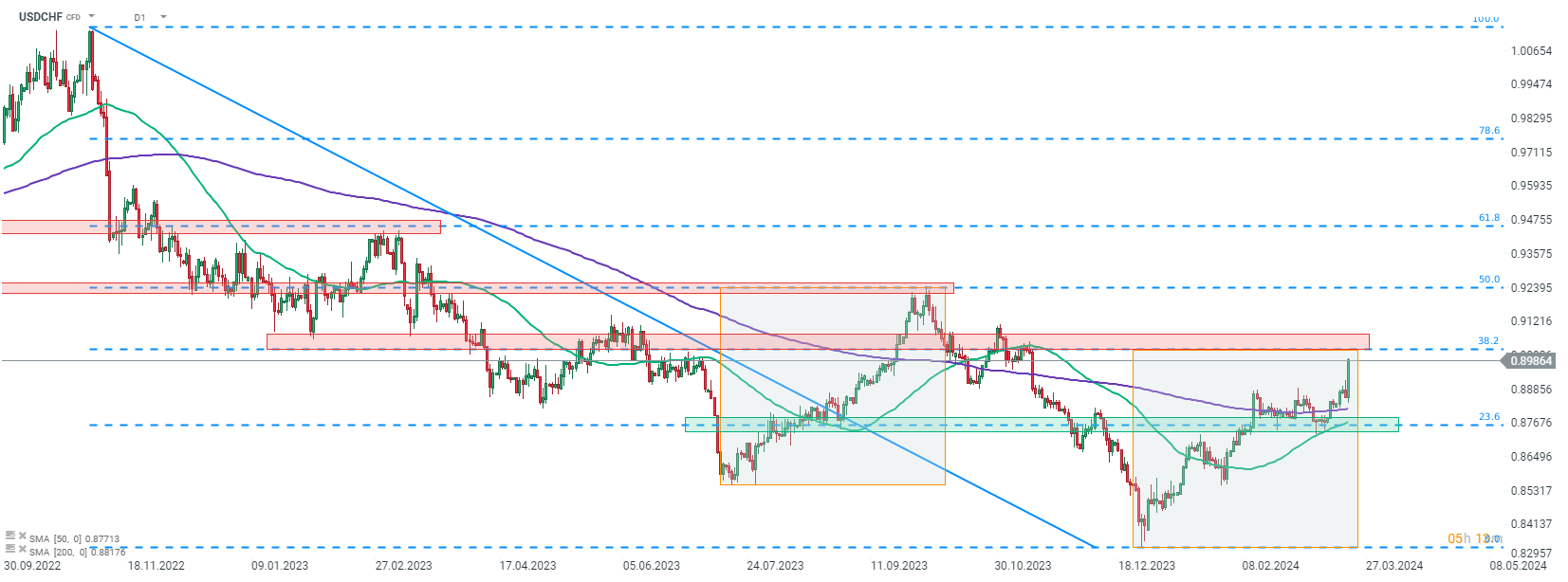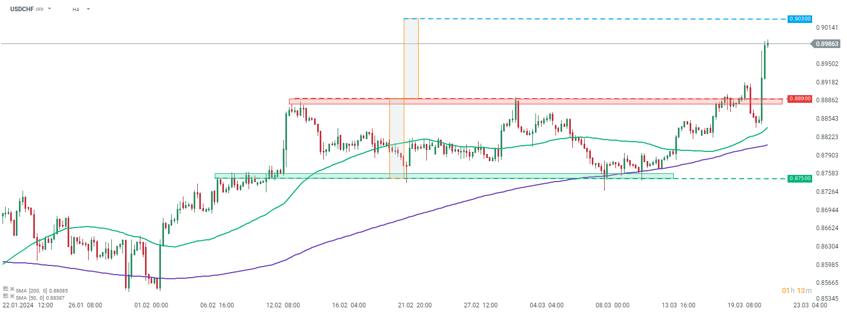 Přesun na nižší časový rámec také ukazuje, že oblast 0,9030 je důležitá. Když se podíváme na USDCHF v intervalu H1, vidíme, že se pár v poslední době obchoduje v pásmu 0,8750-0,8890. Zdá se, že dnešní rozhodnutí SNB poskytlo palivo pro proražení nad horní hranici rozpětí. Učebnicový cíl tohoto proražení lze nalézt v oblasti 0,9030. Pokud se dočkáme proražení nad tuto zónu, pozornost kupců se může přesunout k další zóně odporu z intervalu D1 - k 50 % retracementu v oblasti 0,9240.