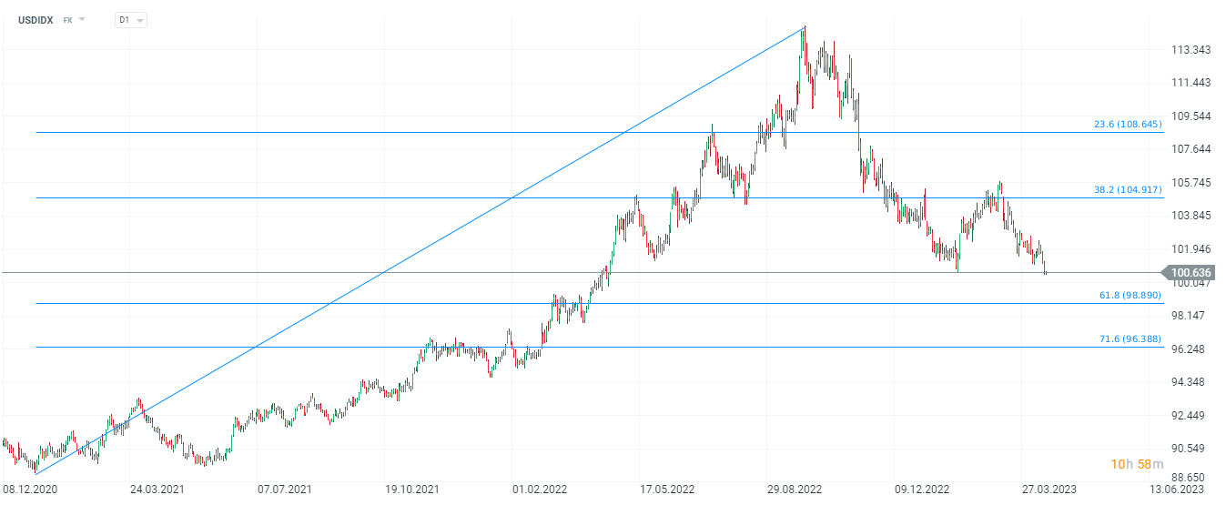 USDIDX graf, interval D1. Index se snaží mírně odrazit po komentáři Bostice, který zdůraznil, že recese není nutná a že Fed se soustředí na inflaci a v květnu zvýší sazby. V širším intervalu se však při pohledu na Fibonacciho retracementy může ukázat, že dalším supportem pro USD je až úroveň 98,9 bodu, kde se nachází 61,8 zrušení klesající vlny započaté v roce 2021. To by ovšem znamenalo překonání psychologické bariéry 100 bodů. Zdroj: xStation5
