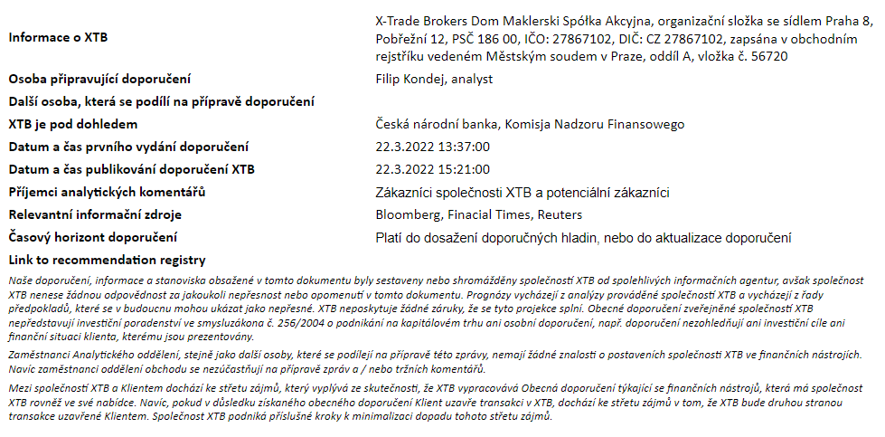 Rozdílové smlouvy jsou komplexní nástroje a v důsledku použití finanční páky jsou spojeny s vysokým rizikem rychlého vzniku finanční ztráty. U 71 % účtů retailových investorů došlo při obchodování s rozdílovými smlouvami u tohoto poskytovatele ke vzniku ztráty. Měli byste zvážit, zda rozumíte tomu, jak rozdílové smlouvy fungují, a zda si můžete dovolit vysoké riziko ztráty svých finančních prostředků. Investování je rizikové. Investujte zodpovědně. Tento materiál je marketingovou komunikací ve smyslu čl. 24 odst. 3 směrnice Evropského parlamentu a Rady 2014/65/EU ze dne 15. května 2014 o trzích finančních nástrojů, kterou se mění směrnice 2002/92/ES a směrnice 2011/61/EU (MiFID II). Marketingová komunikace není investiční doporučení ani informace doporučující či navrhující investiční strategii ve smyslu nařízení Evropského parlamentu a Rady (EU) č. 596/2014 ze dne 16. dubna 2014 o zneužívání trhu (nařízení o zneužívání trhu) a o zrušení směrnice Evropského parlamentu a Rady 2003/6/ES a směrnic Komise 2003/124/ES, 2003/125/ES a 2004/72/ES a nařízení Komise v přenesené pravomoci (EU) 2016/958 ze dne 9. března 2016, kterým se doplňuje nařízení Evropského parlamentu a Rady (EU) č. 596/2014, pokud jde o regulační technické normy pro technická ujednání pro objektivní předkládání investičních doporučení nebo jiných informací doporučujících nebo navrhujících investiční strategie a pro zveřejnění konkrétních zájmů nebo náznaků střetu zájmů nebo jakékoli jiné rady, a to i v oblasti investičního poradenství, ve smyslu zákona č. 256/2004 Sb., o podnikání na kapitálovém trhu. Marketingová komunikace je připravena s nejvyšší pečlivostí, objektivitou, prezentuje fakta známé autorovi k datu přípravy a neobsahuje žádné hodnotící prvky. Marketingová komunikace je připravena bez zohlednění potřeb klienta, jeho individuální finanční situace a nijak nepředstavuje investiční strategii. Marketingová komunikace nepředstavuje nabídku k prodeji, nabídku, předplatné, výzvu na nákup, reklamu nebo propagaci jakýchkoliv finančních nástrojů. Společnost XTB S.A., organizační složka nenese odpovědnost za jakékoli jednání nebo opomenutí klienta, zejména za získání nebo zcizení finančních nástrojů, na základě informací obsažených v této marketingové komunikaci. V případě, že marketingová komunikace obsahuje jakékoli informace o jakýchkoli výsledcích týkajících se finančních nástrojů v nich uvedených, nepředstavují žádnou záruku ani předpověď ohledně budoucích výsledků. Minulá výkonnost nemusí nutně vypovídat o budoucích výsledcích a každá osoba jednající na základě těchto informací tak činí zcela na vlastní riziko.