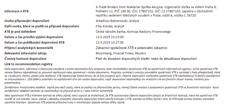 Rozdílové smlouvy jsou komplexní nástroje a v důsledku použití finanční páky jsou spojeny s vysokým rizikem rychlého vzniku finanční ztráty. U 71 % účtů retailových investorů došlo při obchodování s rozdílovými smlouvami u tohoto poskytovatele ke vzniku ztráty. Měli byste zvážit, zda rozumíte tomu, jak rozdílové smlouvy fungují, a zda si můžete dovolit vysoké riziko ztráty svých finančních prostředků. Investování je rizikové. Investujte zodpovědně. Tento materiál je marketingovou komunikací ve smyslu čl. 24 odst. 3 směrnice Evropského parlamentu a Rady 2014/65/EU ze dne 15. května 2014 o trzích finančních nástrojů, kterou se mění směrnice 2002/92/ES a směrnice 2011/61/EU (MiFID II). Marketingová komunikace není investiční doporučení ani informace doporučující či navrhující investiční strategii ve smyslu nařízení Evropského parlamentu a Rady (EU) č. 596/2014 ze dne 16. dubna 2014 o zneužívání trhu (nařízení o zneužívání trhu) a o zrušení směrnice Evropského parlamentu a Rady 2003/6/ES a směrnic Komise 2003/124/ES, 2003/125/ES a 2004/72/ES a nařízení Komise v přenesené pravomoci (EU) 2016/958 ze dne 9. března 2016, kterým se doplňuje nařízení Evropského parlamentu a Rady (EU) č. 596/2014, pokud jde o regulační technické normy pro technická ujednání pro objektivní předkládání investičních doporučení nebo jiných informací doporučujících nebo navrhujících investiční strategie a pro zveřejnění konkrétních zájmů nebo náznaků střetu zájmů nebo jakékoli jiné rady, a to i v oblasti investičního poradenství, ve smyslu zákona č. 256/2004 Sb., o podnikání na kapitálovém trhu. Marketingová komunikace je připravena s nejvyšší pečlivostí, objektivitou, prezentuje fakta známé autorovi k datu přípravy a neobsahuje žádné hodnotící prvky. Marketingová komunikace je připravena bez zohlednění potřeb klienta, jeho individuální finanční situace a nijak nepředstavuje investiční strategii. Marketingová komunikace nepředstavuje nabídku k prodeji, nabídku, předplatné, výzvu na nákup, reklamu nebo propagaci jakýchkoliv finančních nástrojů. Společnost XTB S.A., organizační složka nenese odpovědnost za jakékoli jednání nebo opomenutí klienta, zejména za získání nebo zcizení finančních nástrojů, na základě informací obsažených v této marketingové komunikaci. V případě, že marketingová komunikace obsahuje jakékoli informace o jakýchkoli výsledcích týkajících se finančních nástrojů v nich uvedených, nepředstavují žádnou záruku ani předpověď ohledně budoucích výsledků. Minulá výkonnost nemusí nutně vypovídat o budoucích výsledcích a každá osoba jednající na základě těchto informací tak činí zcela na vlastní riziko.