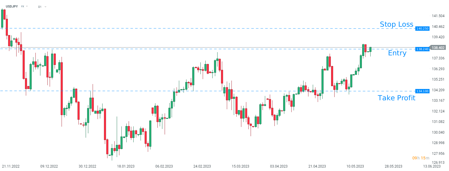 Credit Agricole doporučuje zaujmout krátkou pozici na USDJPY za tržní cenu s cílem 134,10 a stop loss příkazem umístěným na 140,25. Zdroj: xStation5