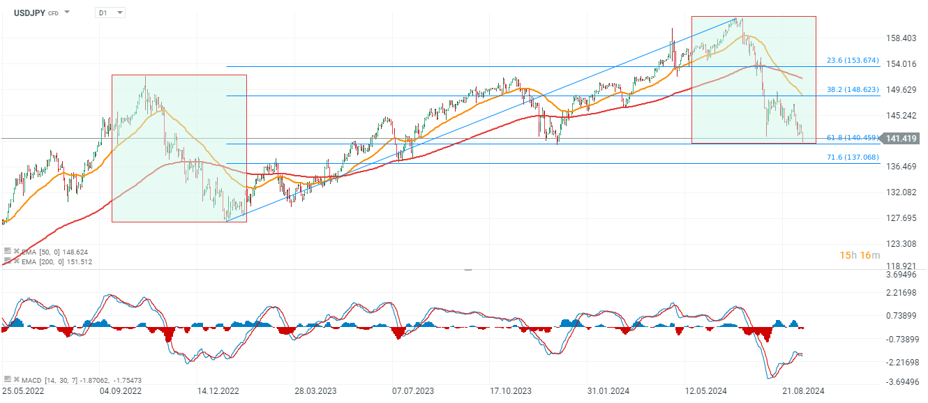 - Spotřebitelská inflace v Japonsku dosáhla v červenci 2,7 % (na 2% cíli BoJ nebo nad ním již 28 měsíců v řadě). Reálné úrokové sazby jsou stále velmi nízké, přičemž obchodníci očekávají, že srpnový propad USDJPY Bank of Japan pravděpodobně nezastaví, z „moře změn“ úrokových sazeb. Poznámky Nakagawy tuto tezi podporují, zatímco konečný výsledek politiky BoJ je stále nejistý, přičemž existuje riziko recese v USA, Evropě a zpomalující poptávky v Číně, což může tlačit na japonské společnosti a ekonomické podmínky.