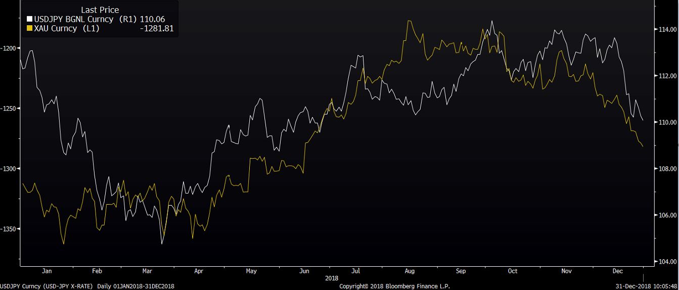 3) V neposlednom rade má USDJPY tendenciu hýbať opačne ako zlato, ktorému očakávania vyššieho úročenia v USA neprajú a naopak očakávania nižšieho úročenia pomáhajú. Rast zlata v posledných týždňoch bol taktiež o niečo silnejší ako pokles USDJPY.