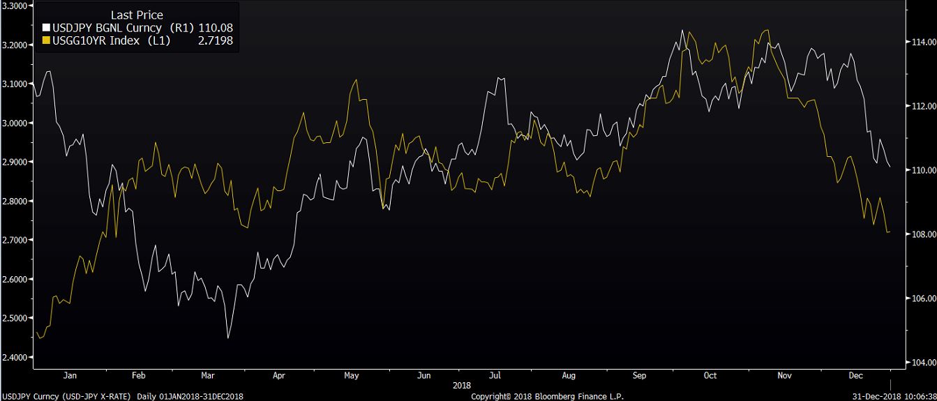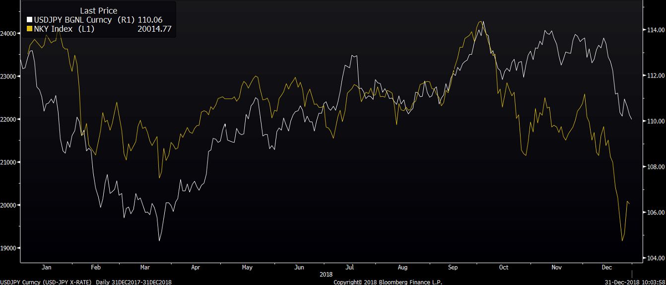 1) USDJPY ako barometer nálady na trhoch má tendenciu sa hýbať spoločne s akciami. Tie v posledných týždňoch klesli podstatne viac ako USDJPY