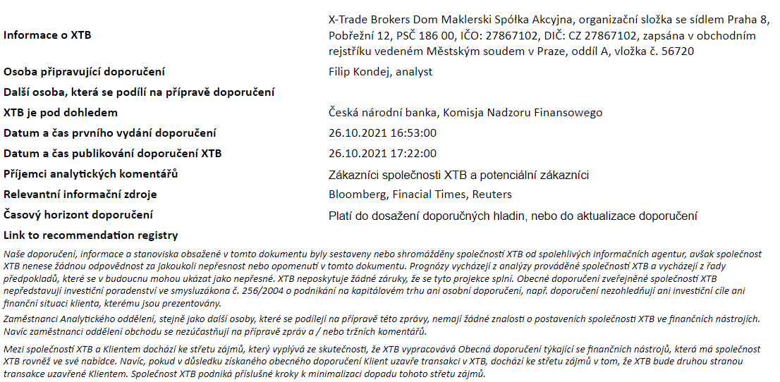 Rozdílové smlouvy jsou komplexní nástroje a v důsledku použití finanční páky jsou spojeny s vysokým rizikem rychlého vzniku finanční ztráty. U 71 % účtů retailových investorů došlo při obchodování s rozdílovými smlouvami u tohoto poskytovatele ke vzniku ztráty. Měli byste zvážit, zda rozumíte tomu, jak rozdílové smlouvy fungují, a zda si můžete dovolit vysoké riziko ztráty svých finančních prostředků. Investování je rizikové. Investujte zodpovědně. Tento materiál je marketingovou komunikací ve smyslu čl. 24 odst. 3 směrnice Evropského parlamentu a Rady 2014/65/EU ze dne 15. května 2014 o trzích finančních nástrojů, kterou se mění směrnice 2002/92/ES a směrnice 2011/61/EU (MiFID II). Marketingová komunikace není investiční doporučení ani informace doporučující či navrhující investiční strategii ve smyslu nařízení Evropského parlamentu a Rady (EU) č. 596/2014 ze dne 16. dubna 2014 o zneužívání trhu (nařízení o zneužívání trhu) a o zrušení směrnice Evropského parlamentu a Rady 2003/6/ES a směrnic Komise 2003/124/ES, 2003/125/ES a 2004/72/ES a nařízení Komise v přenesené pravomoci (EU) 2016/958 ze dne 9. března 2016, kterým se doplňuje nařízení Evropského parlamentu a Rady (EU) č. 596/2014, pokud jde o regulační technické normy pro technická ujednání pro objektivní předkládání investičních doporučení nebo jiných informací doporučujících nebo navrhujících investiční strategie a pro zveřejnění konkrétních zájmů nebo náznaků střetu zájmů nebo jakékoli jiné rady, a to i v oblasti investičního poradenství, ve smyslu zákona č. 256/2004 Sb., o podnikání na kapitálovém trhu. Marketingová komunikace je připravena s nejvyšší pečlivostí, objektivitou, prezentuje fakta známé autorovi k datu přípravy a neobsahuje žádné hodnotící prvky. Marketingová komunikace je připravena bez zohlednění potřeb klienta, jeho individuální finanční situace a nijak nepředstavuje investiční strategii. Marketingová komunikace nepředstavuje nabídku k prodeji, nabídku, předplatné, výzvu na nákup, reklamu nebo propagaci jakýchkoliv finančních nástrojů. Společnost XTB S.A., organizační složka nenese odpovědnost za jakékoli jednání nebo opomenutí klienta, zejména za získání nebo zcizení finančních nástrojů, na základě informací obsažených v této marketingové komunikaci. V případě, že marketingová komunikace obsahuje jakékoli informace o jakýchkoli výsledcích týkajících se finančních nástrojů v nich uvedených, nepředstavují žádnou záruku ani předpověď ohledně budoucích výsledků. Minulá výkonnost nemusí nutně vypovídat o budoucích výsledcích a každá osoba jednající na základě těchto informací tak činí zcela na vlastní riziko.