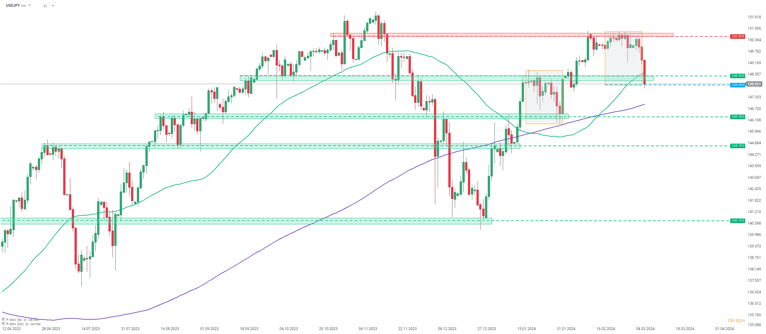 Když se podíváme na graf USDJPY v intervalu D1, můžeme vidět, že pár dnes poprvé od poloviny ledna klesl pod 50-sekční klouzavý průměr (zelená čára) a obchoduje se na nejnižší úrovni za měsíc. Dvojice testuje oblast 148,00, označenou spodní hranicí struktury Overbalance. Prolomení níže by teoreticky naznačovalo obrat trendu k medvědímu. Obchodníci by však měli mít na paměti, že to není poprvé, kdy trhy ohlašují bezprostřední konec záporných sazeb v Japonsku, a proto zůstává 19. března prostor pro zklamání.