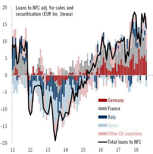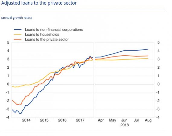 ECB dnes zverejnila svoje štatistiky monetárneho vývoja. Tie na rozdiel od niektorých iných dát dodávajú dôvod pre optimizmus – rast úverov súkromnej sfére si siahol na nové predkrízové maximá. Nahor ho ťahal rast firemného dlhu , medziročne o 4,2%, rast dlhu domácností zase vzrástol na 3,1%, v oboch prípadoch sú to nové pokrízové maximá. Čiže, domáca spotreba a investície budú naďalej podporovať ekonomiku. S exportmi to je slabšie, čo sa podpisuje na viacerých horších číslach, exporty tovarov a služieb však našťastie tvoria len 28 % HDP.