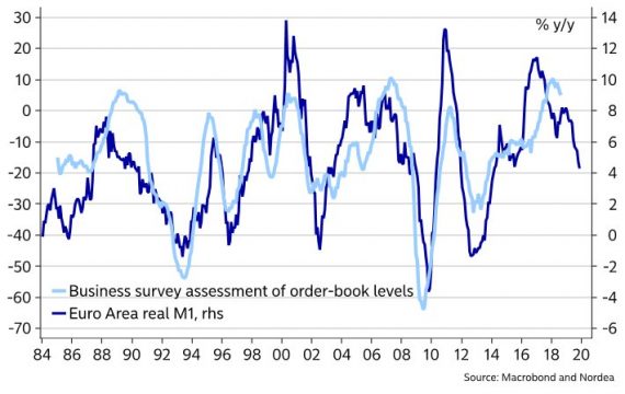 Vývoj medziročnej zmeny menového agregátu M1 a subindexu nových objednávok v rámci prieskumu výrobnej dôvery (@MikaelSarwe)