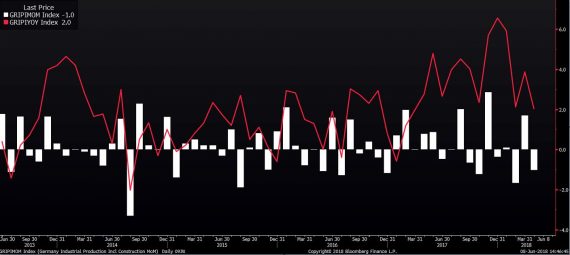 Po včerajších priemyselných objednávkach sklamala aj nemecká priemyselná výroba. Tá klesla v apríli medzimesačne o 1%, čakal sa pritom rast o 0,4%. Medziročne je jej zmena na rozdiel od objednávok stále v pluse, rast na úrovni 2% je však najpomalší od marca 2017. Aby toho nebolo málo, tak nečakaný pokles o 0,5% hlási priemyselná produkcia aj vo Francúzsku.
