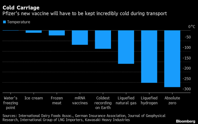 Vakcína spoločností Pfizer/BioNTech proti novému koronavírusu sa musí počas transportu skladovať pri teplote -70 °C, čo môže spôsobovať logistické problémy farmaceutickým spoločnostiam a nemocniciam. Táto teplota je oveľa nižšia, ako teplota, pri akej sa prepravuje napríklad mrazené mäso. Problém je, že skvapalnený plyn a vodík dosahujú ďaleko nižšie teploty. Krajiny teda budú musieť vybudovať hlboko zmrazené výrobné, skladovacie a prepravné siete pre distribúciu vakcíny. Problém teda môže vzniknúť pri distribúcii vakcíny chudobnejším krajinám.