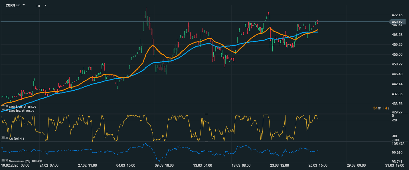 Cena kukuřice se aktuálně drží nad EMA 50 na úrovni 465,78 i nad SMA 100 na hodnotě 464,79, což značí pokračující převahu kupců. Williams %R se pohybuje kolem -13, tedy v pásmu blízkém překoupenosti, což ukazuje na silný krátkodobý růst, ale zároveň i na možnost menšího zklidnění. Momentum na úrovni 100,43 naznačuje, že růstová dynamika zatím přetrvává, i když není extrémně silná. Z technického pohledu bude nyní klíčové, zda kukuřice dokáže stabilně prorazit nad oblast 469 až 470 bodů. Pokud ano, mohl by trh otevřít prostor pro růst k vyšším hladinám kolem 475 až 480 bodů. Naopak při odmítnutí této rezistence by mohlo dojít ke krátkodobému návratu do pásma 465 až 460 bodů, kde leží nejbližší podpory.