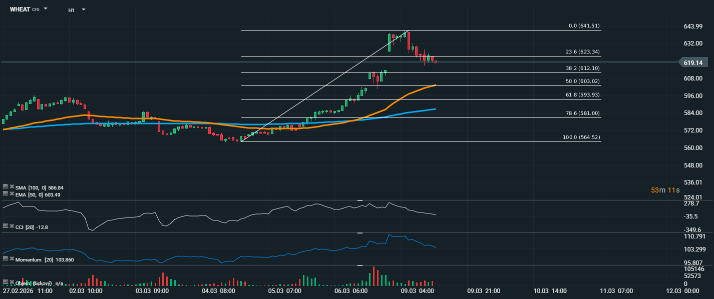 Cena pšenice po silném růstovém impulsu narazila na rezistenci poblíž 641,51 a následně přešla do korekce. Aktuálně se obchoduje kolem 619,14, tedy v blízkosti Fibonacciho hladiny 23,6 % (623,34) a zároveň nad úrovní 38,2 % (612,10). Trh tak část předchozího růstu odevzdal, ale zatím zůstává v technicky relativně příznivém nastavení. Pozitivním signálem je, že cena se stále drží nad klouzavými průměry EMA 50 (603,49) i SMA 100 (586,84), což potvrzuje, že hlavní krátkodobý trend zůstává navzdory aktuálnímu oslabení růstový. Korekce po prudkém pohybu vzhůru je zatím spíše přirozeným výdechem trhu než potvrzením obratu do klesajícího trendu. Důležitá bude především oblast kolem 612,10, která nyní funguje jako nejbližší technická podpora. CCI se posunulo zpět k neutrálním hodnotám, což naznačuje vyprchání překoupenosti a ochlazení předchozího silného růstového momenta. Momentum sice zůstává nad neutrální hranicí, ale směřuje níže, což ukazuje na slábnoucí dynamiku kupců v krátkém horizontu. Objemová aktivita navíc během korekce nevypadá extrémně panicky, takže trh zatím nepůsobí dojmem výrazného výprodeje.