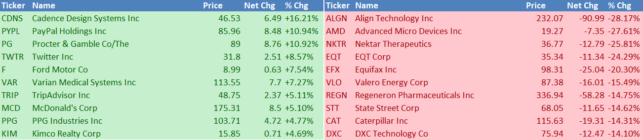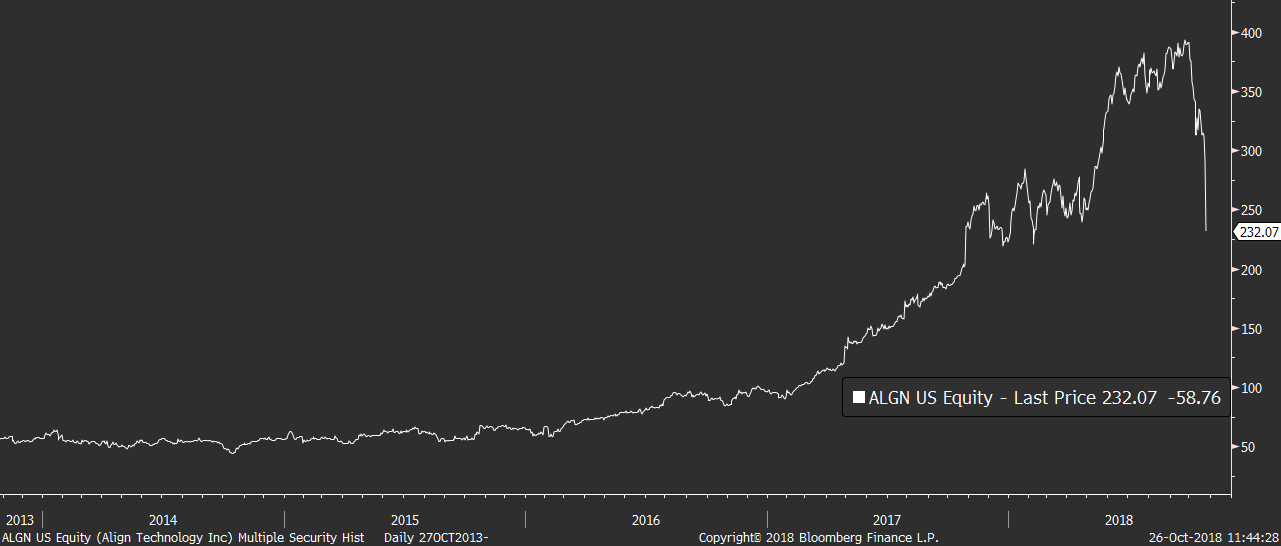 AMD ale nebyla zdaleka jedinou společností s více než 20 % ztrátou. Podobně na tom byly i další čtyři společnosti v čele s Align Technology, jejíž akcie klesly o 28 %. ALGN je nyní už mid-cap společností (market cap. 9,8 mld. USD), která se zabývá inovacemi v oblasti „neviditelných“ zubních rovnátek. Společnost sice vykazuje solidní růst příjmů a zisků (20 – 30 % y/y), její velmi nevýrazný guidance na 4Q ale investory nepříjemně zaskočil a akcie díky němu kompletně vymazala i zbytek svých letošních zisků. Její P/E ratio na 87 je přitom i po aktuálním výplachu velmi odvážné.