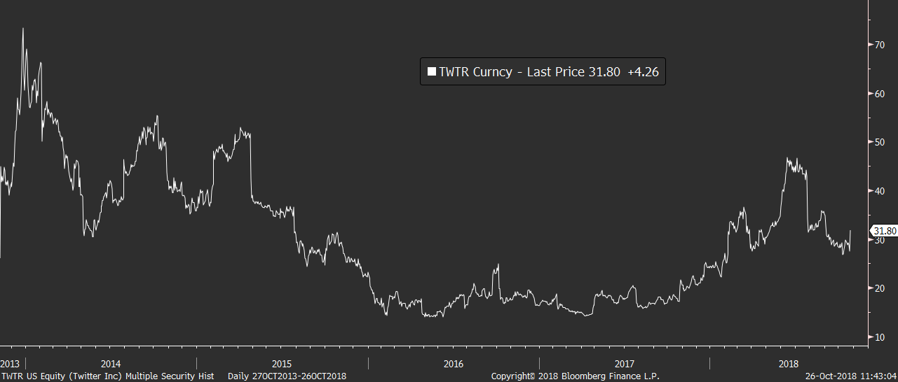 Twitter je dlouhodobě ošklivé káčátko mezi technologickými akciemi, ale jeho čísla z tohoto týdne dala naději, že by se jeho image mohla do budoucna začít konečně zlepšovat. Počty uživatelů sice kvůli mazání falešných účtů opět klesly, management ale překvapil nečekaně robustním růstem příjmů (28 % y/y), který naznačuje, že se společnosti konečně daří hledat zdroje příjmů ve svém, dosud ne zrovna výdělečném, business modelu.