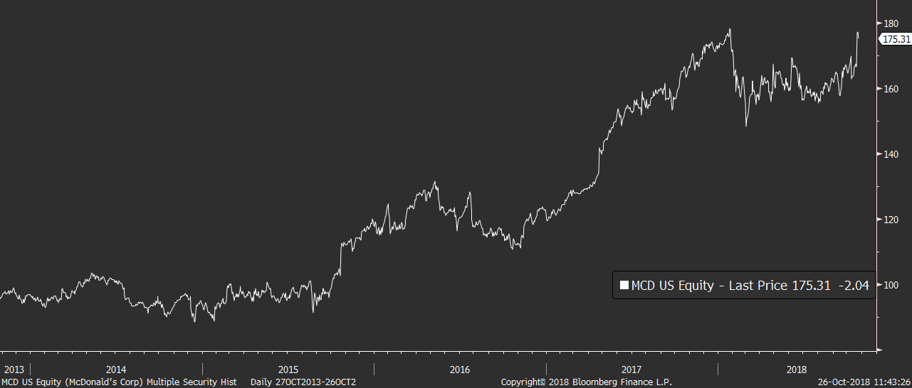 McDonalds sice nerostl zdaleka tolik, jako nejlepší akcie v S&P500, růst o 5,7 % u defensivní a „líné“ akcie tohoto typu je to ale i tak obdivuhodný počin. Obzvlášť vzhledem k tomu jak málo ji zatím zasáhl říjnový výprodej na akciových trzích. MCD překvapil hlavně v oblasti zisku. Růst marží o více než procento totiž umožnil navyšovat zisk i při klesajících tržbách, které jsou výsledkem snahy o zefektivnění fungování celé korporátní struktury a zvýšení podílu franšíz z 92 na 95 %.