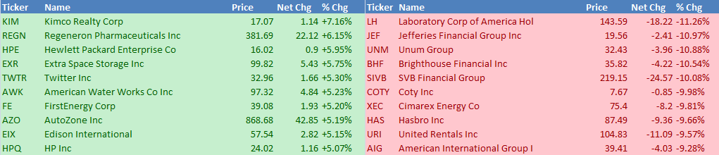 Co se opačného konce žebříčku týká, zde se objevilo hned pět titulů se ztrátou přesahující 10 %. Nejhůře dopadla farmaceutická společnost Laboratory Corp of America (LH), jejíž akcie klesly o více než 11 %. Na vině je hlavně výprodej z minulého pátku, kdy akcie reagovaly na zmírnění výhledu pro růst tržeb, který byl revidován z 10,7 % na 10,1 %. Akcie LH si v minulých letech procházely velmi stabilním a býčím trendem, který ale skončil letos, kdy se po pádu o 25 % dostávají na nejnižší cenu od loňského léta.