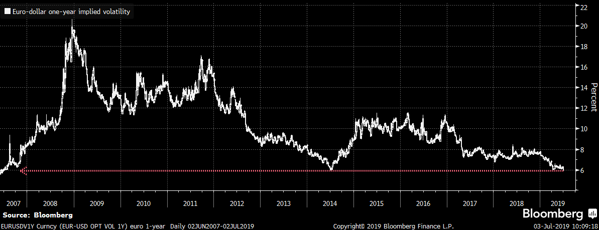 Přestože politická rizika v poslední době držela implikovanou volatilitu na akciovém trhu na zvýšených úrovních, na FX se odehrává zcela opačný příběh. Implikovaná volatilita v roce 2019 výrazně klesá a nikde to není více patrné, než na hlavním měnovém páru EURSD.