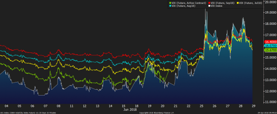 Co se futures na volatilitu týká, zde byly pohyby samozřejmě tradičně o něco méně divoké než na spotu. V pondělí tak červencový futures zaútočil na hranici 17,5b. a tento úrok si zopakoval ještě jednou ve čtvrtek. Dnes se pak díky evropskému summitu dostává zpět pod hranici 16b., takže i v tomto týdnu shortování volatility neslo své ovoce v případě, že obchodníci dokázali využít rychlých spiků z pondělí a ze čtvrtka.