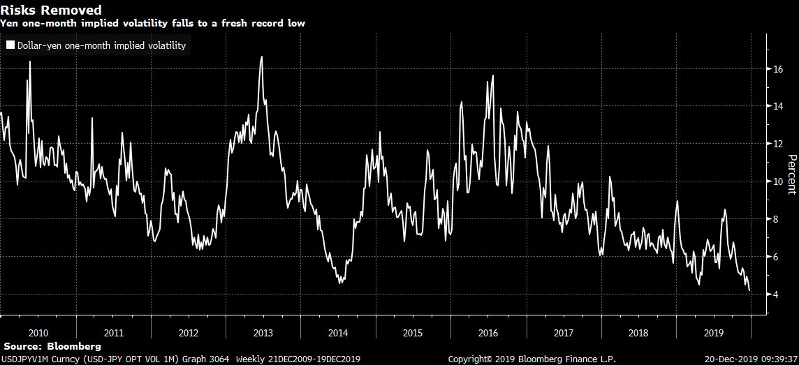 Volatilita na měnovém páru USDJPY klesá ke 4 %. Zdroj: Bloomberg
