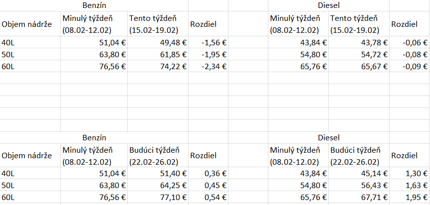 Analytik spoločnosti X-Trade Brokers, Lukáš Lipovský, na základe vývoja cien PHM v Rotterdame očakáva, že ceny benzínu a dieslu by mali zaznamenať v priebehu dvoch až troch týždňov nárast od troch do piatich centov za liter oproti priemerným cenám z predchádzajúceho týždňa. Priemerné ceny benzínu na Slovensku sa behom minulého zvýšili o 2,3 centu za liter, pričom priemerné ceny dieslu sa nezmenili oproti priemerný cenám z predchádzajúceho týždňa.