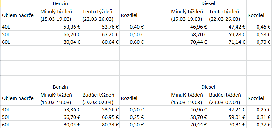 Analytik spoločnosti X-Trade Brokers, Lukáš Lipovský, na základe vývoja cien PHM v Rotterdame očakáva, že ceny benzínu a dieslu by mali zaznamenať v priebehu dvoch až troch týždňov pokles od jedného do troch centov za liter oproti priemerným cenám z predchádzajúceho týždňa. Priemerné ceny benzínu vzrástli o 0,1 centu za liter, pričom priemerné ceny dieslu sa na Slovensku behom minulého týždňa nezmenili.