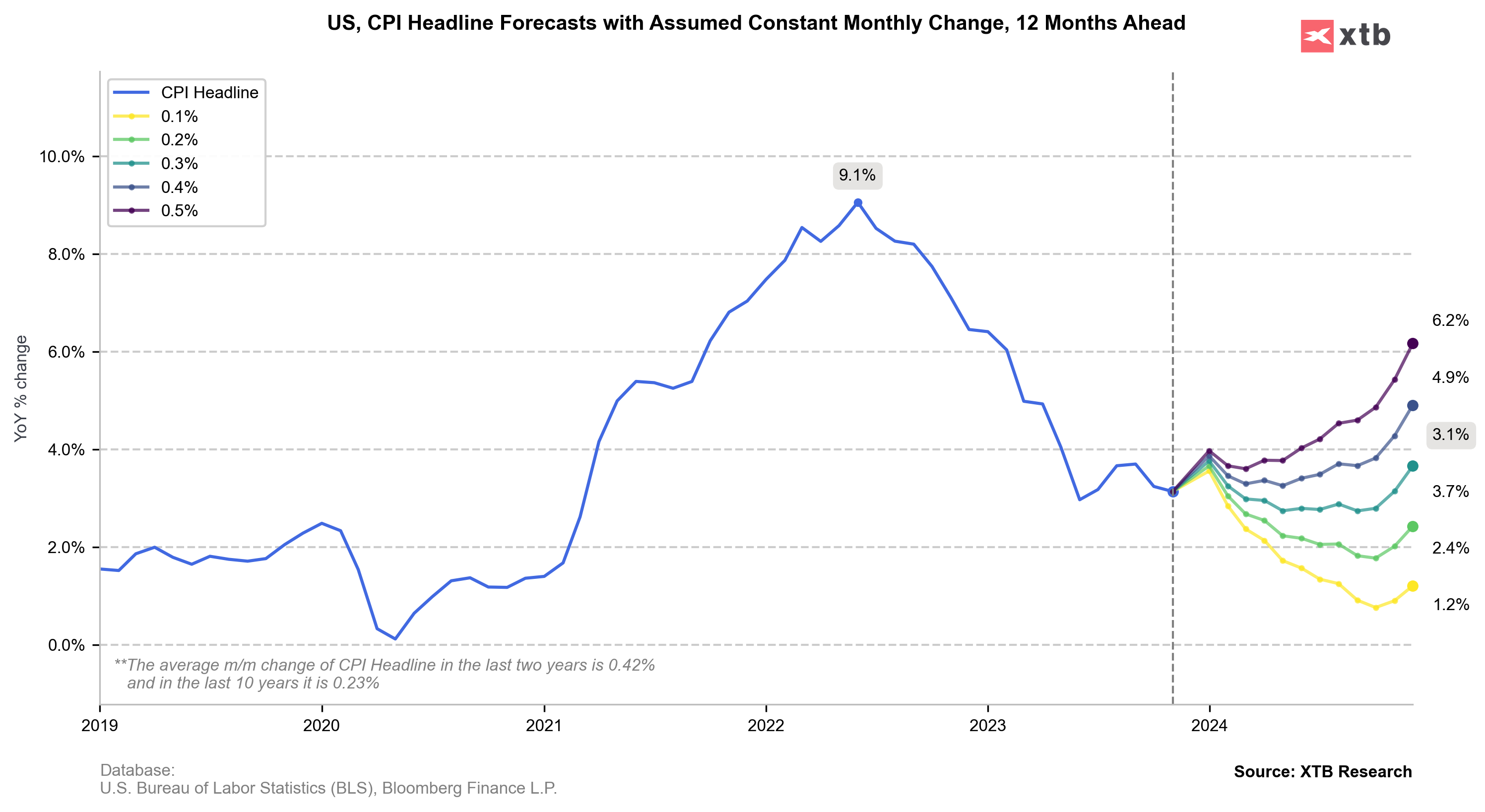 Výše uvedený graf nám umožňuje analyzovat, jak by se vyvíjely roční údaje o inflaci za předpokladu konstantních meziměsíčních změn. Zde by si za předpokladu historického průměru přibližně 0,23 % (zelený průběh) inflace v roce 2024 zachovala klesající trend. Výjimkou by mohl být začátek letošního roku, kdy bychom v důsledku efektu srovnávací základny mohli zaznamenat mírně vyšší hodnoty.