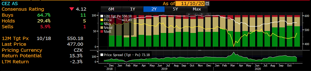 Většina analytiků Bloombergu doporučuje ČEZ ke koupi. Dvanáctiměsíční cílová cena dosahuje na 550 korun za akcii. Zdroj: Bloomberg
