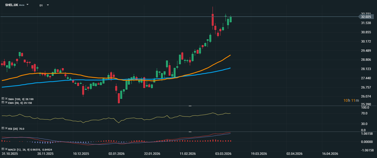Akcie společnosti Shell se obchodují kolem 32,03 GBP a nadále potvrzují silný růstový trend. Cena se drží výrazně nad klouzavými průměry, konkrétně nad EMA 50 na úrovni přibližně 29,16 GBP i nad SMA 100 kolem 28,20 GBP, což podporuje pokračující býčí nastavení trhu. Po delší konsolidaci na přelomu roku titul v posledních týdnech výrazně akceleroval směrem vzhůru a dostal se k oblasti předchozích maxim. Aktuálně se cena pohybuje těsně pod rezistenční zónou okolo 32,2–32,3 GBP, kde je patrná snaha trhu o další průraz. Pokud by se Shell podařilo tuto bariéru překonat, otevřel by se prostor pro pokračování růstu i do vyšších pater. RSI se nachází kolem hodnoty 70, tedy na hranici překoupeného pásma. To potvrzuje sílu současného trendu, zároveň ale upozorňuje na možnost krátkodobého zpomalení nebo technické korekce.