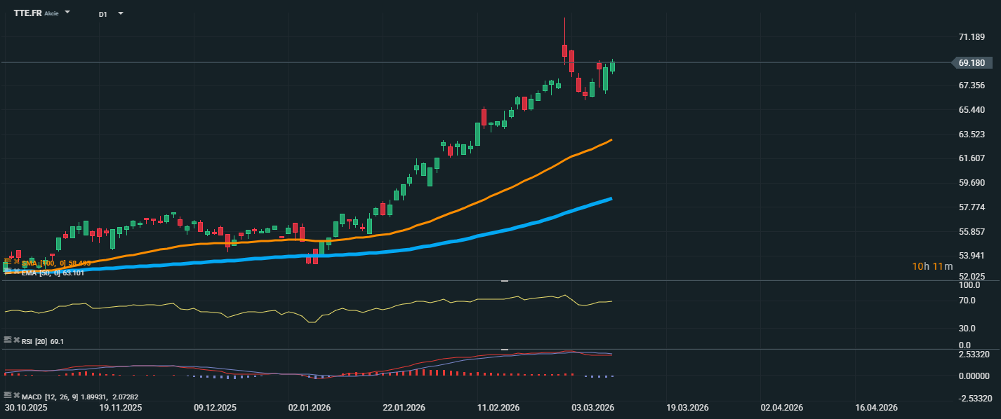 Akcie společnosti TotalEnergies se pohybují poblíž 69,18 EUR a rovněž si drží velmi pozitivní technické nastavení. Cena se nachází nad oběma klouzavými průměry, nad EMA 50 přibližně na 63,10 EUR i nad SMA 100 kolem 58,49 EUR, což potvrzuje stabilní střednědobý růstový trend. Po krátké korekci v úvodu března se cena znovu odrazila vzhůru a aktuálně se vrací k důležité rezistenční oblasti kolem 69,2 až 71,2 EUR. Tato zóna bude pro další vývoj klíčová, protože její překonání by mohlo potvrdit pokračování růstu a návrat k novým lokálním maximům. RSI se pohybuje kolem 69,1, tedy těsně pod hranicí překoupenosti. Trh tak zůstává silný, ale zároveň už se dostává do pásma, kde může být citlivější na výběr zisků.