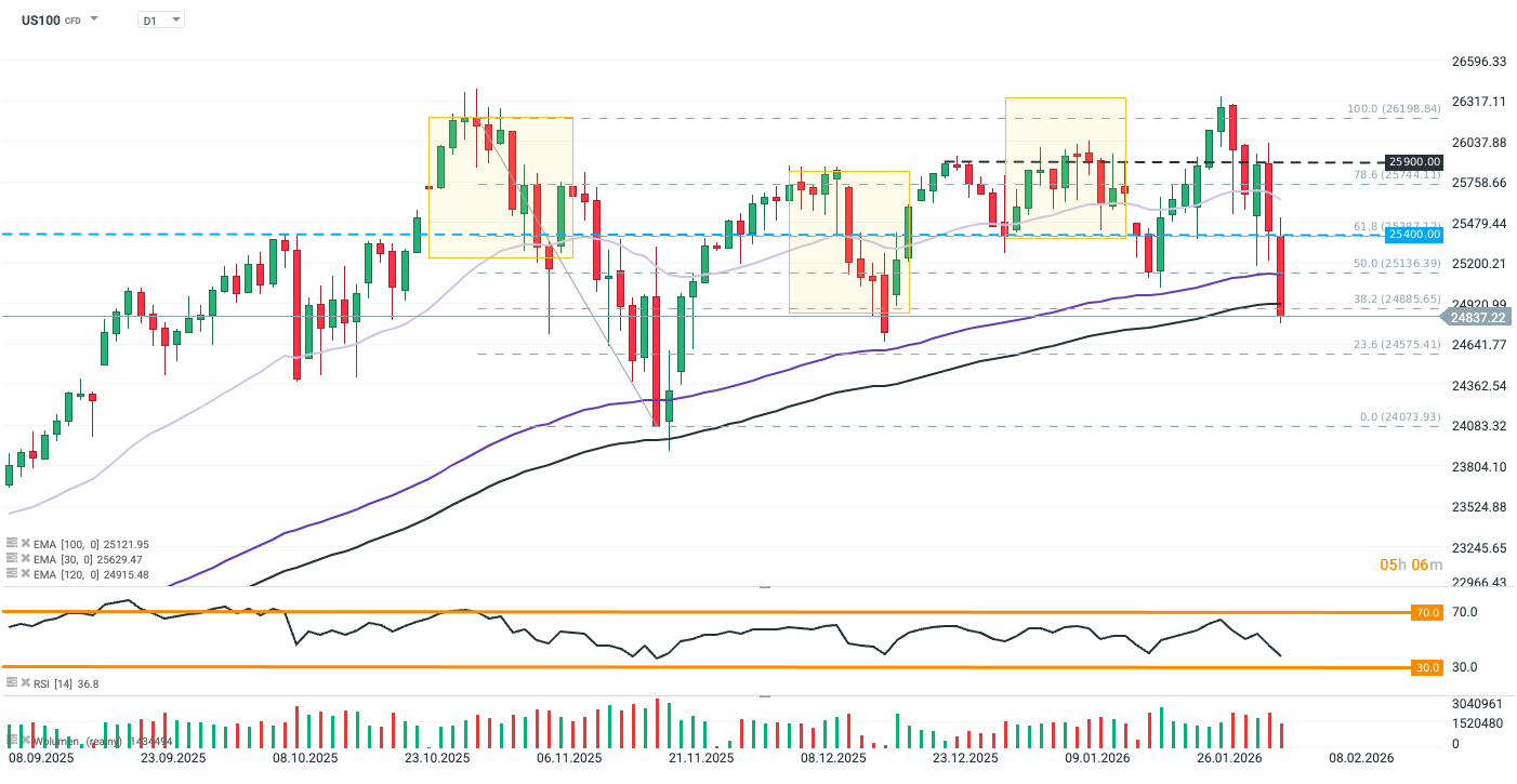 US100 rozšiřuje ztráty o další 2 % a poprvé od prosince 2025 klesá pod hranici 25 000 bodů.