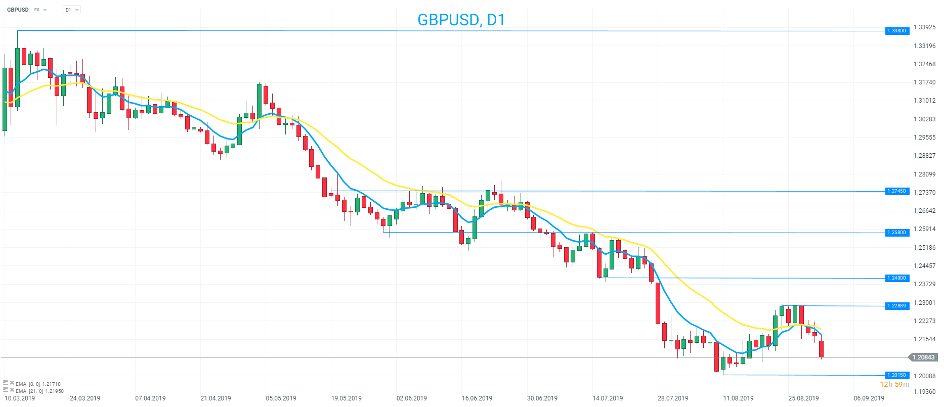 Po pokusu o korekci na GBPUSD se libra opět sesunula na nižší hodnoty a je zpět v blízkosti nejnižších úrovní za posledních několik desítek let. Klouzavé průměry 8/21 EMA zůstávají v medvědí orientaci. Pozornost obchodníků je nyní soustředěna na support v okolí 1,2015. Zdroj: xStation5