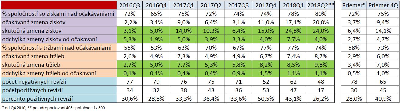 Aby som to prepojil s ekonomikou, tak zisky naďalej výrazne ťahajú nahor nižšie dane (a ešte aj do konca roka budú). Vo veľkej miere však pomáha aj ekonomika, čo ukazuje ďalšie zrýchlenie rastu tržieb blízko k dvojciferným úrovniam. Pomáhajú aj vyššie ceny ropy a komodít, práve v týchto dvoch sektoroch bol zaznamenaný najrýchlejší rast ziskov a tržieb. Prepad podielu pozitívnych revízií naznačuje, že efekty nižších daní a aj silnej ekonomiky sú už v očakávaniach budúceho vývoja započítané. Celkovo teda bola výsledková sezóna veľmi úspešná, čo v posledných týždňoch pomohlo americkým akciám.