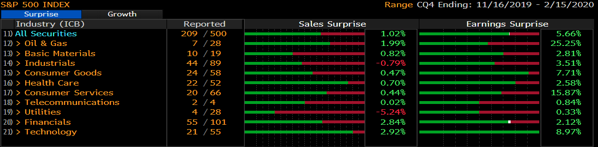 Zatím nejúspěšnějším sektorem je dlouhodobý tahoun celého akciového trhu - technologie. Přibližně 90 % společností v sektoru překonalo konsenzus v tržbách a neuvěřitelných 100 % v zisku. Překonání konsenzu v obou oblastech přitom patřilo sektorově mezi největší (tržby +2,9 %, zisky +8,97 %). Brzdou celého indexu se zatím zdají být hlavně těžaři a sektor základních materiálů, i když ani v jejich případě se rozhodně o žádná tragická čísla nejedná.