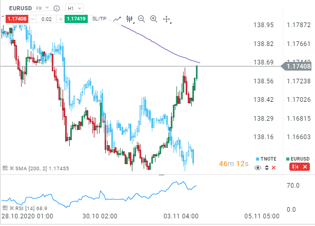 EURUSD zaznamenal nárast uprostred zreteľného nárastu výnosov - trh začína oceňovať Bidenovo víťazstvo (na to je však ešte skoro). Kontrakty na US500 sa otvárajú vyššie a sú už na svojich včerajších maximách.