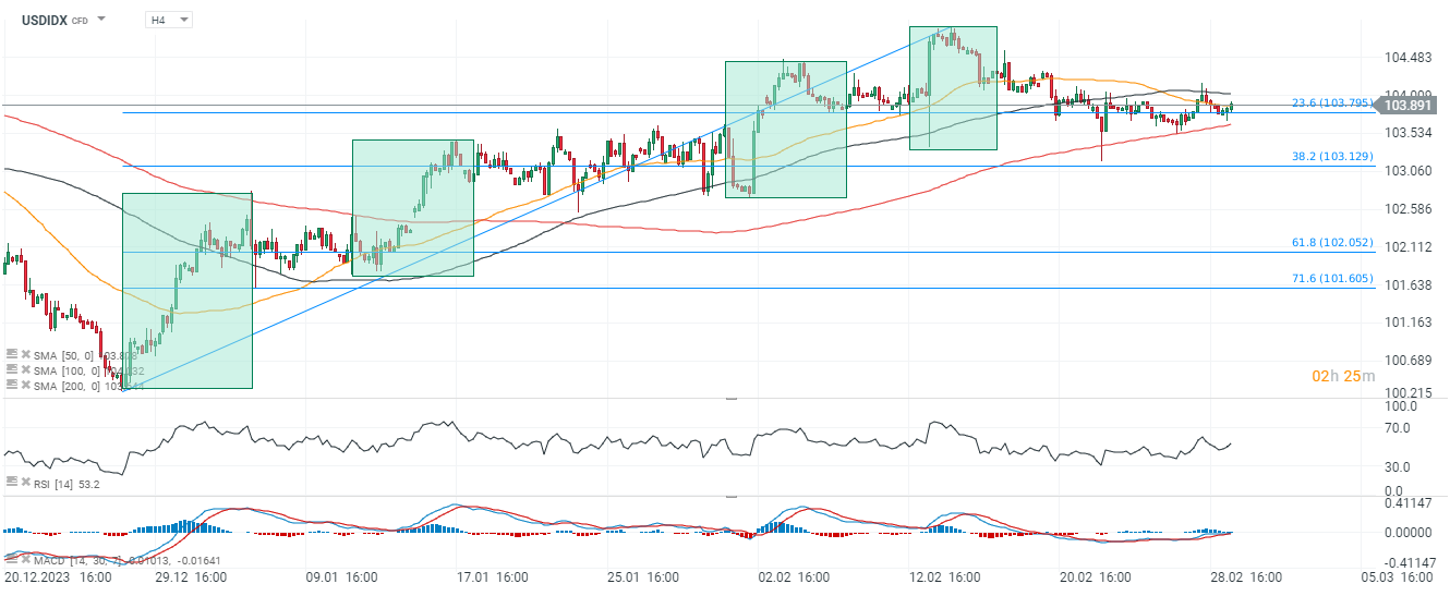Americký dolar (USDIDX) před dnešním zveřejněním údajů o inflaci PCE (14:30 ) mírně posiluje. Agentura S&P poukázala na to, že americká ekonomika si nadále vede lépe než ostatní a jako jediná z největších vyspělých ekonomik v roce 2023 zvýšila růst navzdory prudkému zvýšení úrokových sazeb. Mezitím se členové Federálního rezervního systému Williams, Collins a Bostic včera vyjádřili k výhledu inflace a měnové politiky v USA. Všichni členové zdůraznili potřebu postupovat při uvolňování měnové politiky opatrně. Raphael Bostic a John Williams naznačili, že cesta inflace k poklesu na 2 % může být proměnlivá. Co dalšího se z jejich komentářů dozvídáme?