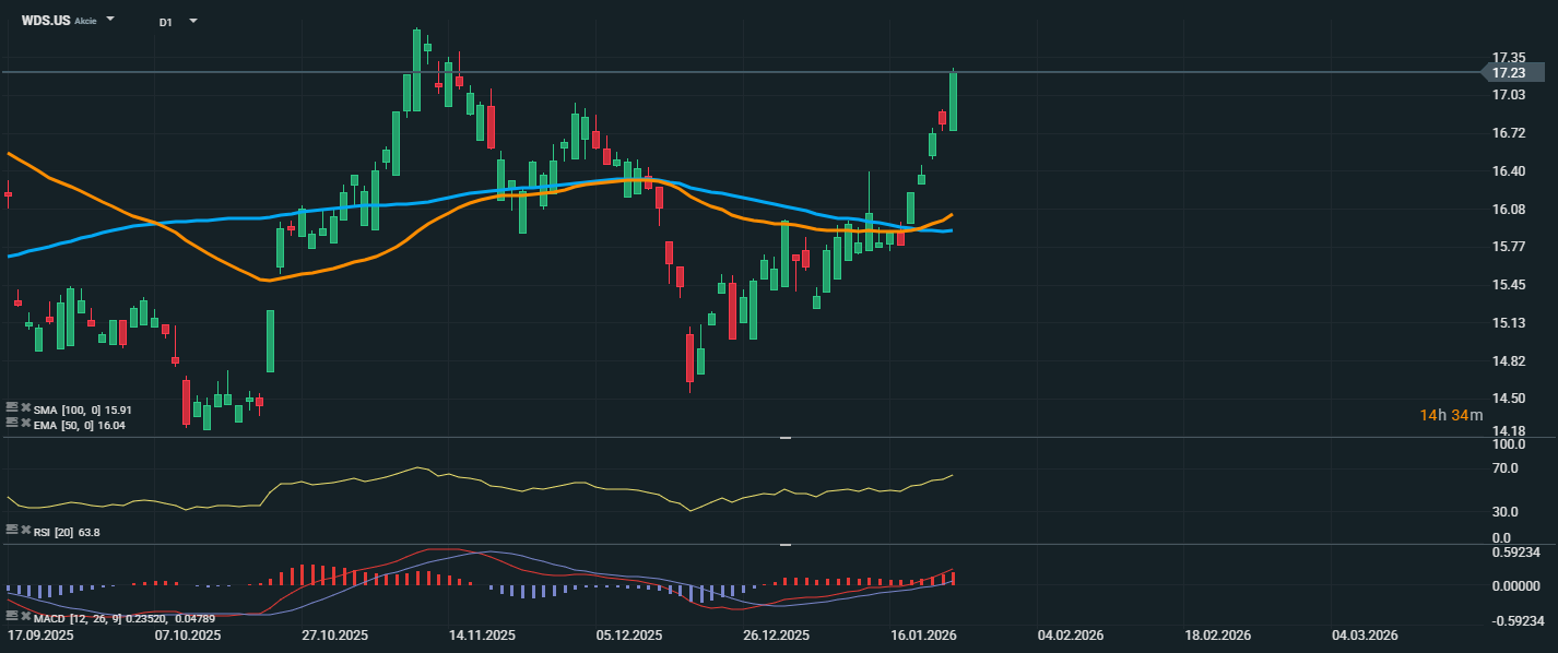 Akcie společnosti Woodside Energy zaznamenaly v posledních dnech prudký růst a aktuálně se obchodují na ceně 17,23 USD. Cena prorazila nad klíčové klouzavé průměry – EMA 50 (16,04 USD) i SMA 100 (15,91 USD) – a potvrzuje tím býčí trend. RSI se pohybuje na úrovni 63,8, což značí zvýšený nákupní zájem, přesto se zatím nenachází v překoupeném pásmu. Z pohledu rezistencí bude klíčové sledovat úroveň 17,35 USD, což je aktuální maximum. V případě korekce může jako první podpora posloužit oblast kolem 16,70–16,40 USD, kde se cena naposledy konsolidovala.