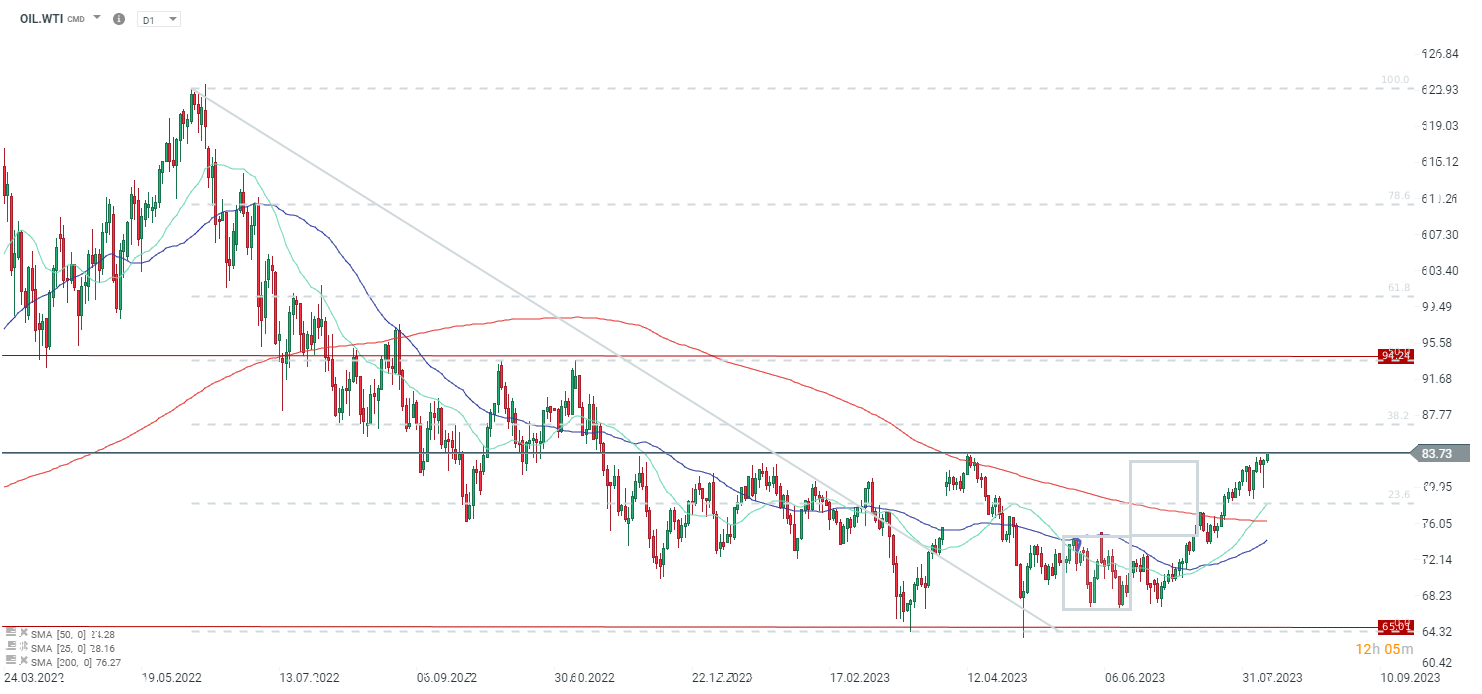WTI (OIL.WTI) překonala lokální maximum z dubna a další rezistenci lze nalézt v oblasti 85 dolarů, kde se nachází 38,2% retracement, a také poblíž hranice 87 dolarů za barel. Zdroj: xStation5