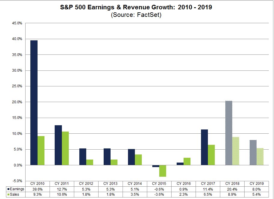 Celkovo ostávajú pre rok 2019 očakávania stále solídne (hoci ešte pri pohľade na graf vyššie pravdepodobne o niečo klesnú). Očakáva sa medziročný rast ziskov o 8%, čo by bola po rokoch 2017 a 2018 tretia najvyššia úroveň od roku 2011. A to isté platí aj pre tržby, od ktorých sa očakáva rast na úrovni 5,4%.