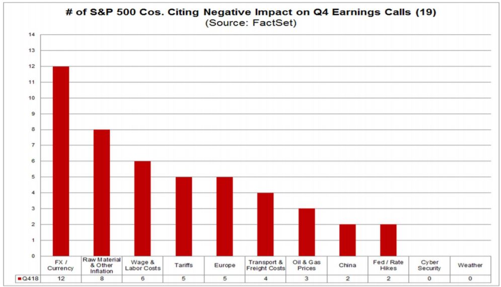 Zaujímavé je, že zatiaľ firmy príliš nehovoria pri negatívnom dopade na výsledky hospodárenia o Číne či obchodných vojnách. Z 19 firiem, spomenulo clá 5 a Čínu 2. Na prvých troch miestach sú pritom silný dolár (12); vysoké ceny surovín (8) či rast mzdových nákladov (6). A to vytvára určitý priestor pre pozitívne prekvapenie, pretože akcie padali najmä kvôli obavám o dopady obchodných vojen.
