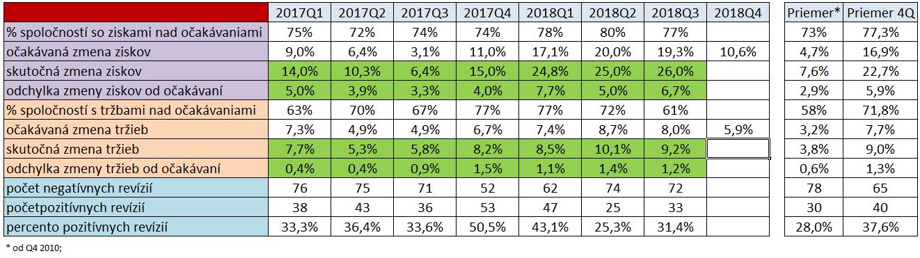 Pozrime sa najskôr, čo sa od aktuálnej výsledkovej sezóny očakáva. Počíta sa s výrazným spomalením medziročného rastu ziskov, z mimoriadne vysokých 26% v treťom kvartáli na 10,6%. Podobne je to aj pri tržbách, z 8% na 5,9%. Rast ziskov (a pravdepodobne aj tržieb) bude určite pomalší ako v treťom kvartáli, kvôli vysokej báze z minulého roka. Minimálne pri ziskoch sú z nášho pohľadu tieto prognózy veľmi nízke, keďže medziročný efekt nižších korporátnych daní v USA ovplyvní zisky ešte aj vo štvrtom kvartáli (v tom nasledujúcom už nie). Čiže existuje vysoký potenciál pre ďalšie pozitívne prekvapenie.